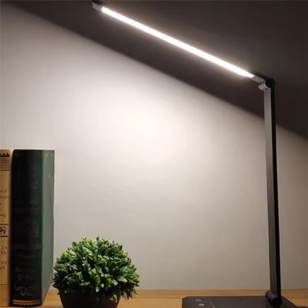 Diese LED-Tischlampe vereint modernes Design mit praktischen Funktionen für produktives Arbeiten oder entspanntes Lesen. Ausgestattet mit einer kabellosen Ladefunktion, einem Touch-Bedienfeld und fünf einstellbaren Lichtmodi ist sie perfekt für Arbeitszimmer, Schlafzimmer oder Büros. Dank des klappbaren Arms und der kompakten Basis passt sie mühelos auf jeden Tisch.