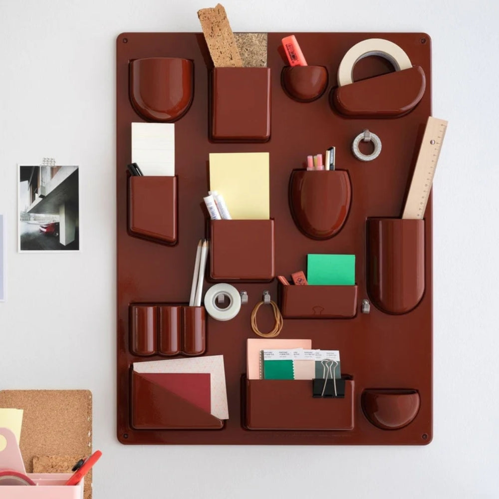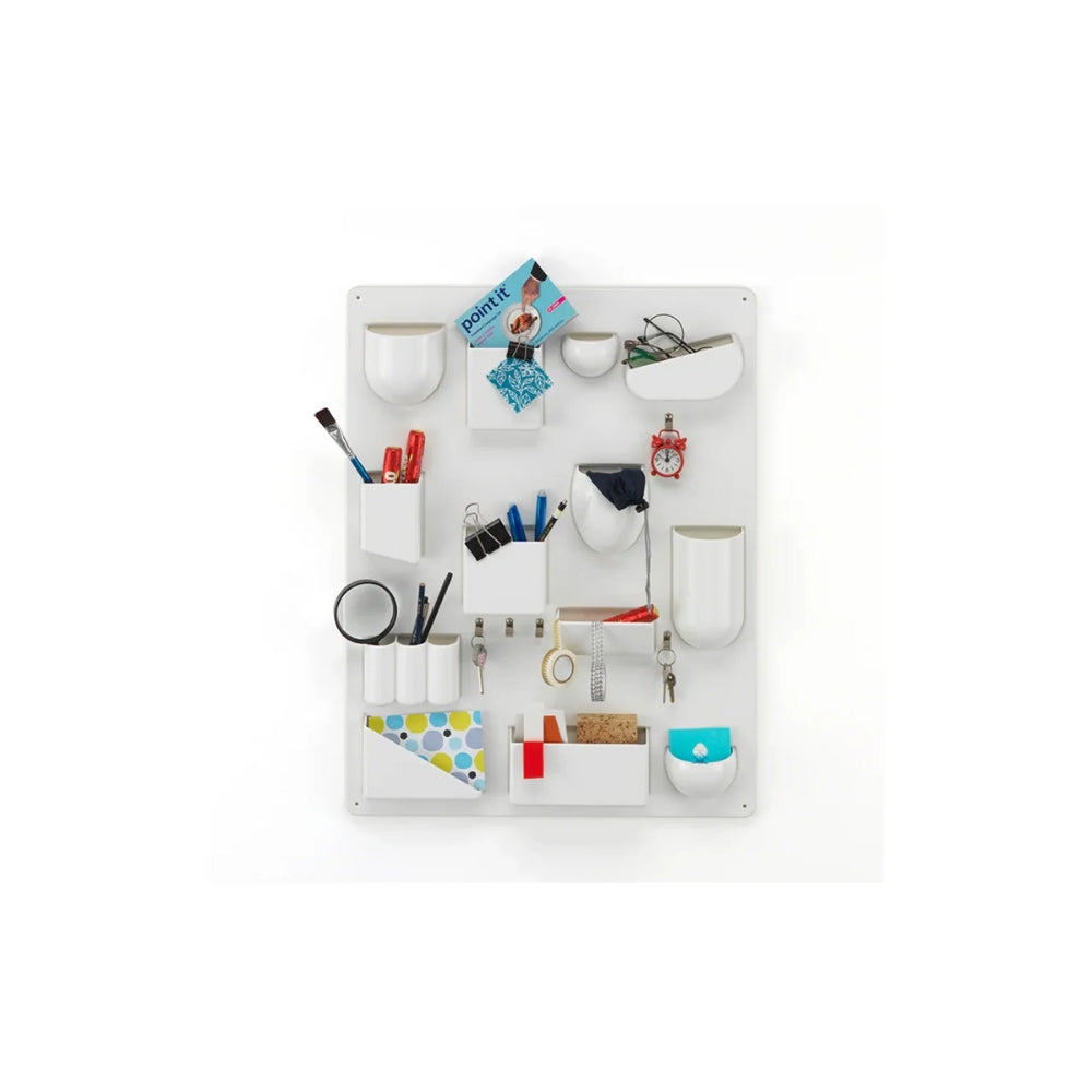 Dieser Wandorganizer kombiniert funktionales Design mit einer spielerischen Ästhetik und bietet eine praktische Lösung zur Aufbewahrung kleiner Alltagsgegenstände. Seine durchdachte Anordnung aus Fächern, Haken und Clips bringt Struktur und Übersicht in Küche, Bad, Büro oder Werkstatt.
